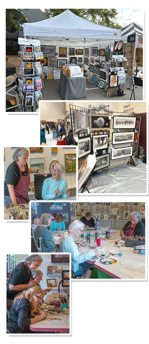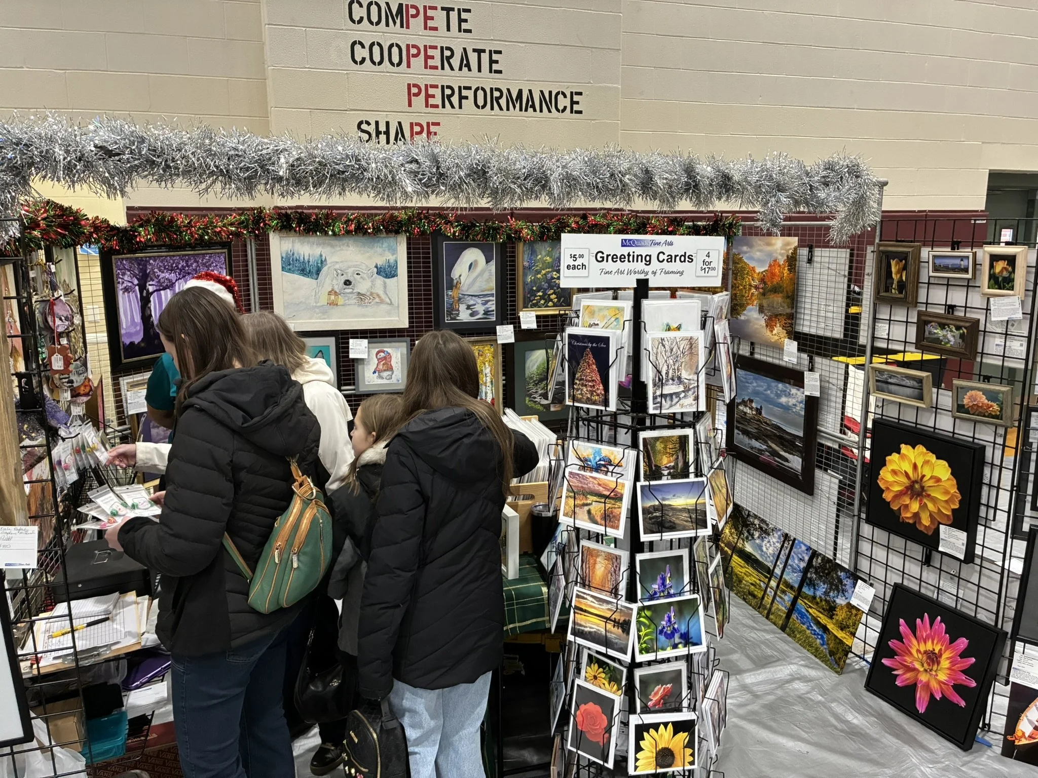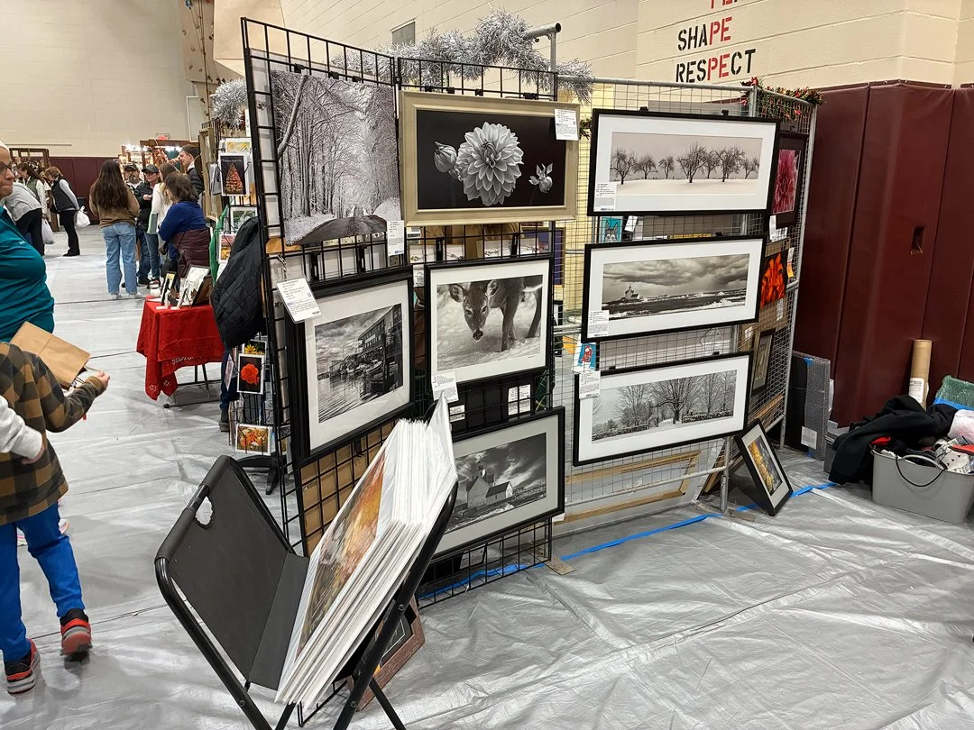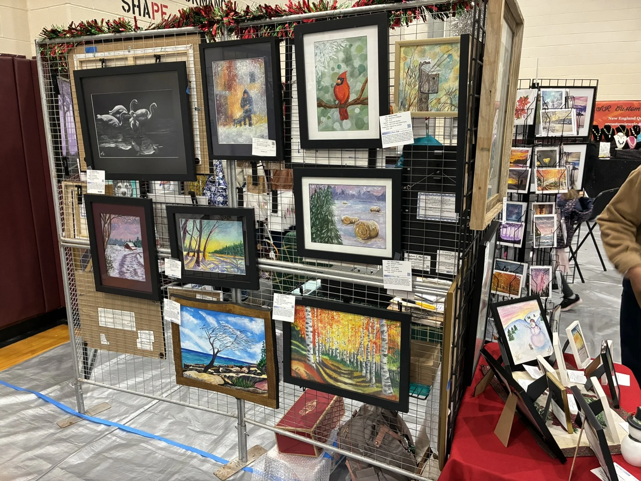 Our location in the Middle School gymnasium allowed us to display work both inside the booth and along the exterior walls, giving us space to present nearly sixty artworks, along with holiday cards and ornaments. We were delighted to place several original pieces during the fair, with additional sales in the days that followed.