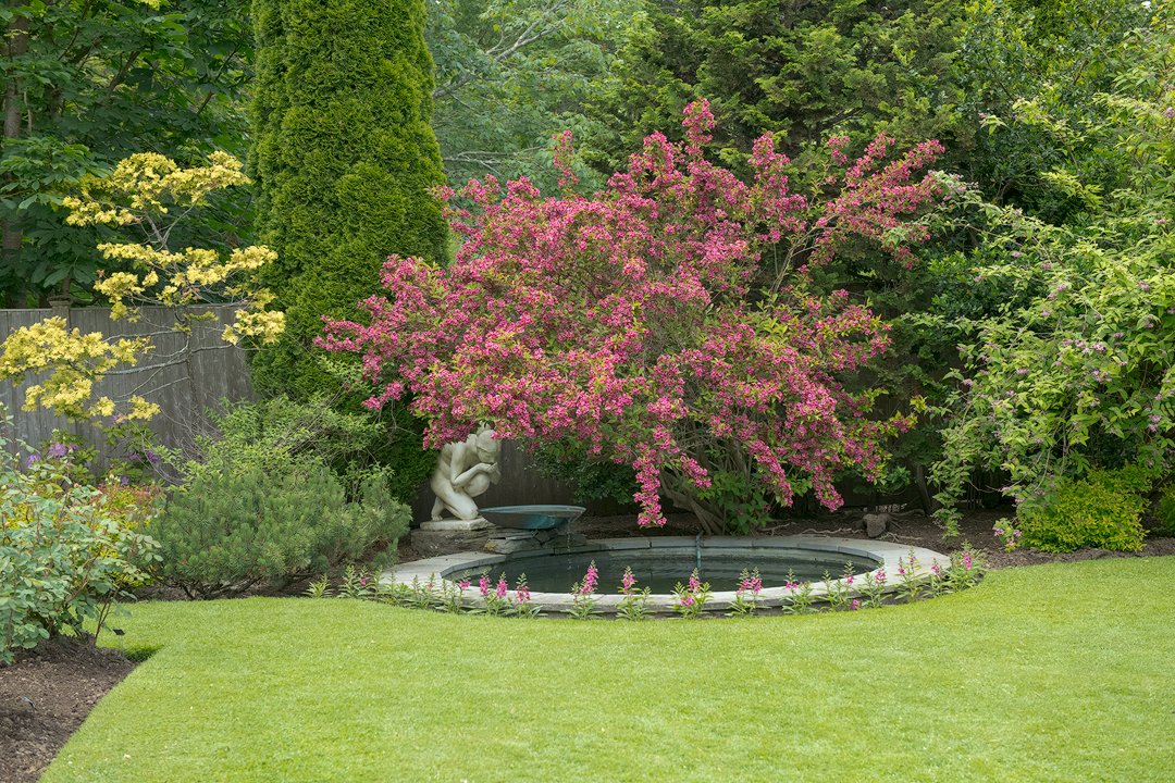 One of two fountains within this estate garden. This one is located at the far end of the second, smaller rose garden adjacent the greenhouse.