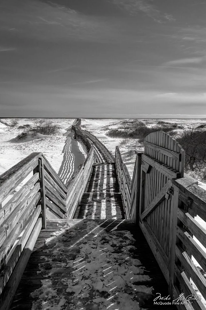 Across the Sleeping Dunes captures a rare moment of winter stillness along the New England coast, where wind-shaped snow blankets the dunes and silence settles across the landscape. A wooden boardwalk leads the viewer forward, guiding the eye through sweeping textures of snow, grass, and sky toward the distant horizon.