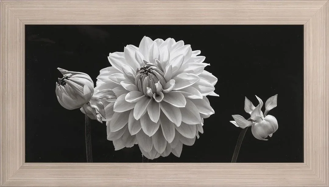 24”x 12” Pigment ink print on Epson Professional Luster stock, mounted under non-glare glass in a light gray wood frame. The frames outer dimension is 27.5”x 17.5”.