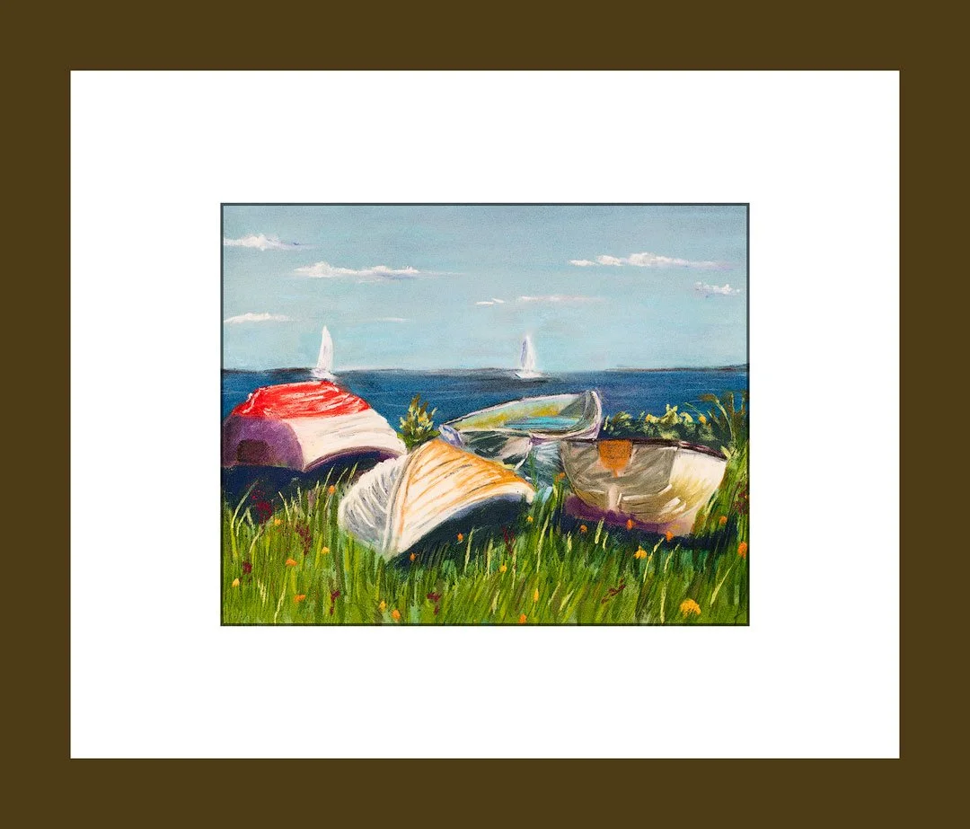 Beached on a summer shore, these well-worn dinghies rest among wildflowers, their work done for the day. The scent of salt lingers in the breeze as sailboats glide silently across the horizon. Stephanie McQuade captures a moment between motion and memory, where the boats wait patiently for another journey—or perhaps just one more tide.